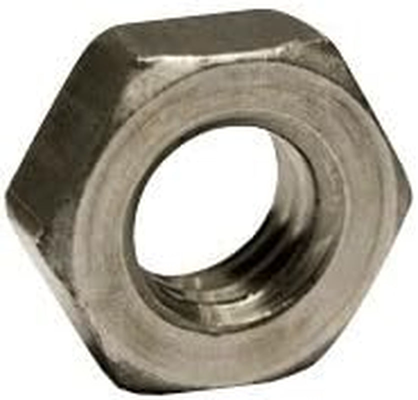 A six-sided internally threaded fastener with flat tops and chamfered corners