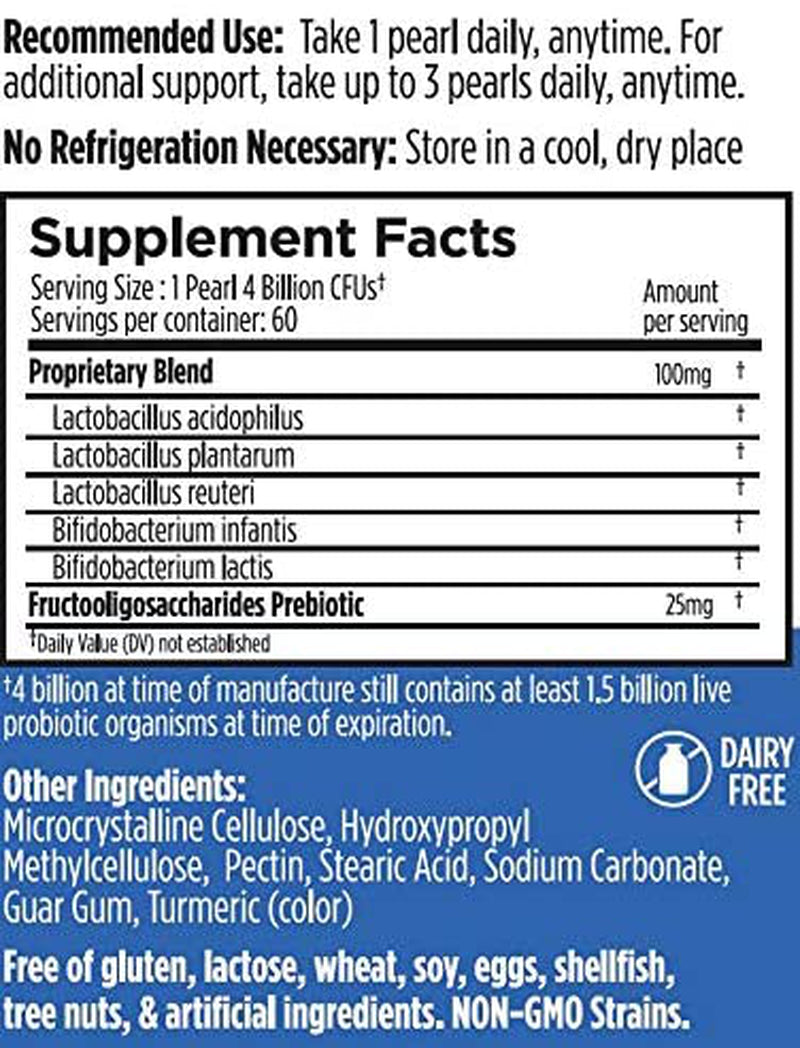 - INNOVATIVE PEARL DESIGN: The innovative pearl form has the texture of a "Smarties" candy. Suck on it for a few seconds to make it incredibly easy to swallow. It also makes them 15 times more effective than your average capsule because it delivers 15 times more live bacteria directly to the source (intestinal tract). Our pearl probiotics are one of a kind because the delivery systems of this design acts like no other can.