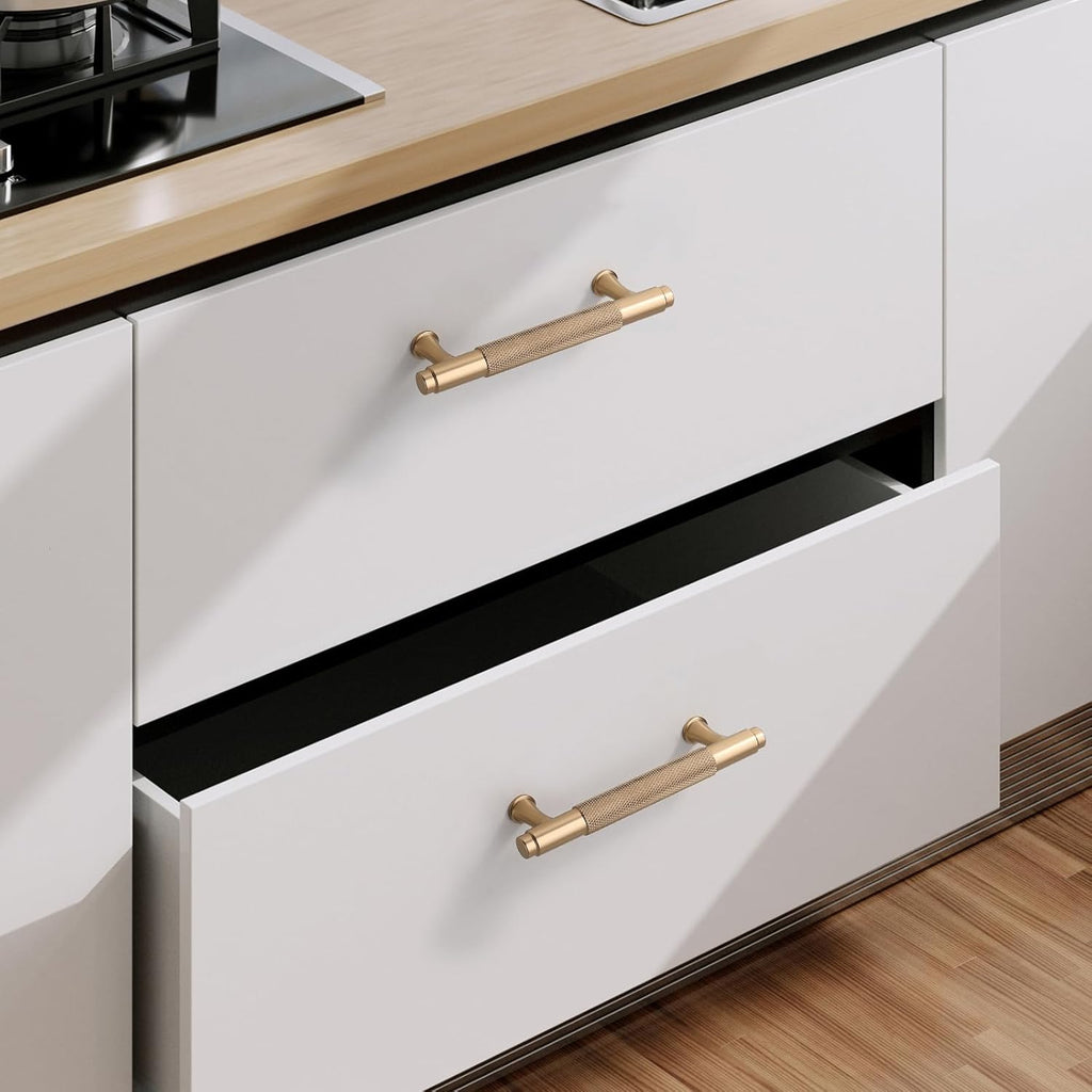 - Knurled Design: We add knurled elements to the pulls, adding aesthetics and chic sense, which making your home cabinet a brand new looking and showing unique taste. Knurled desigh on drawer handle make it more convenient for you to use it, even if there are some water drops or oil in your hands, it ca be easily pull in and out.