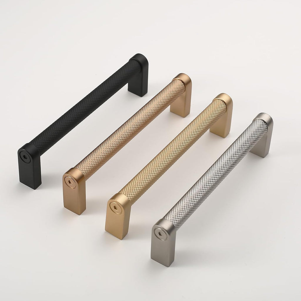 - Knurled Design: We add knurled elements to the pulls, adding aesthetics and chic sense, which making your home cabinet a brand new looking and showing unique taste. Knurled desigh on drawer handle make it more convenient for you to use it, even if there are some water drops or oil in your hands, it ca be easily pull in and out.