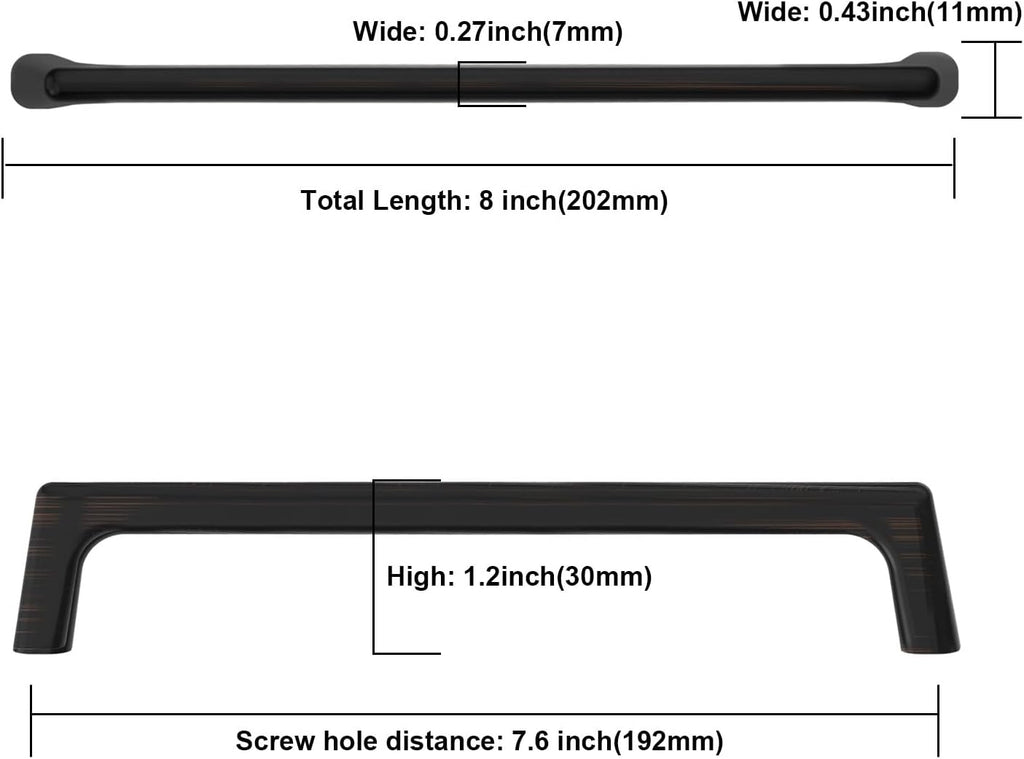 - Size of cabinet hardware: Hole Centers(CC): 7.5 inch(192MM); Overall Length: 8 inch(202MM); Height: 1.2 inch(30MM); Width: 0.27 inch(7MM). Please check the size of the handle you need carefully before you buy