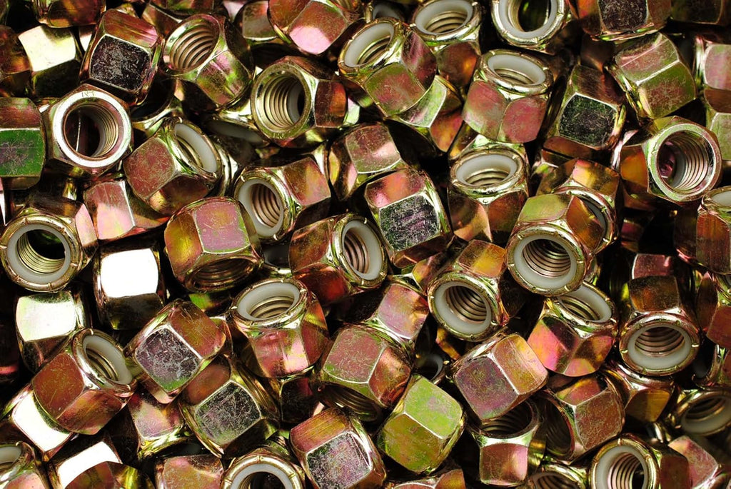 These grade C/8 yellow zinc plated nuts are 3/4-10 thread with a 1-1/8" hex and nylon thread locking insert.