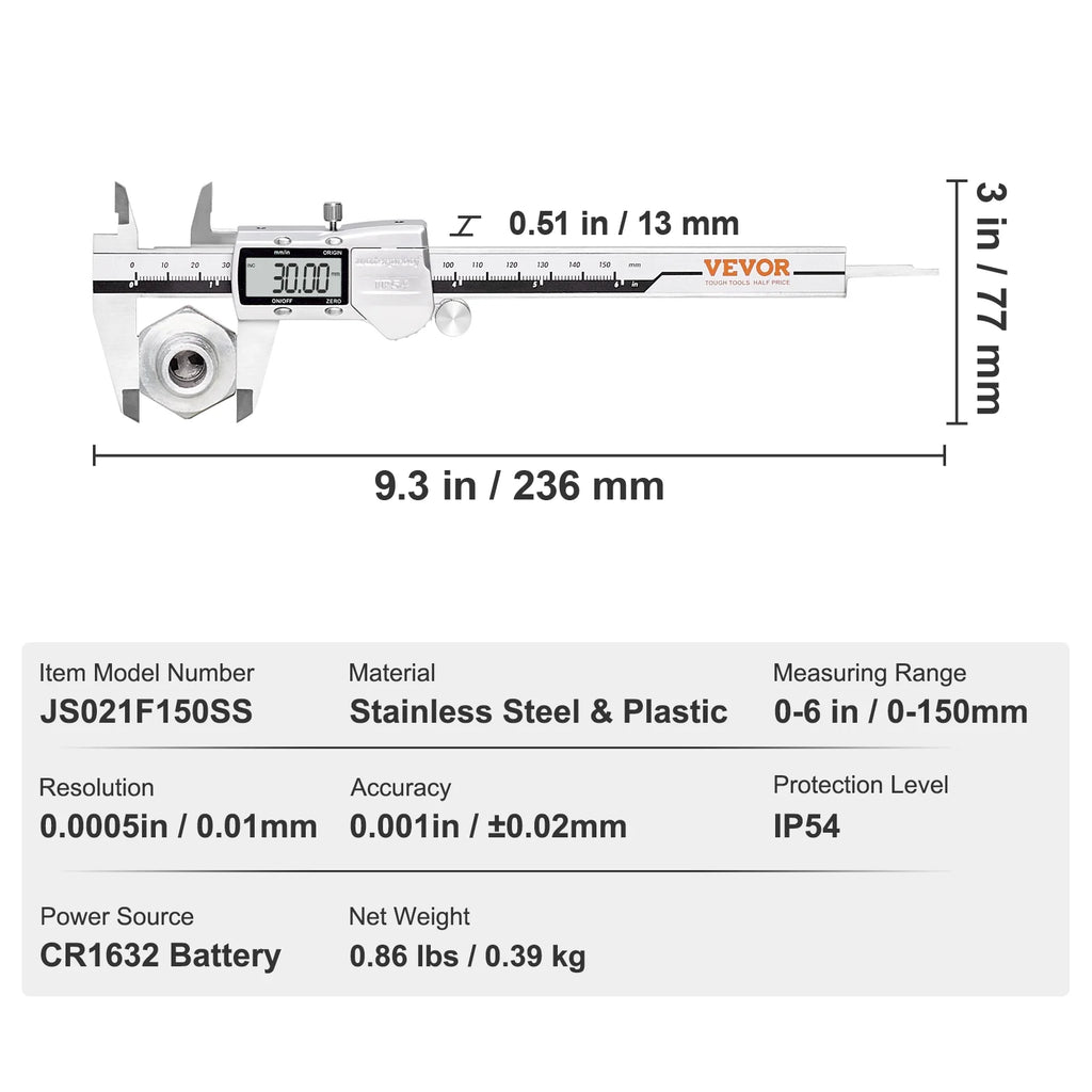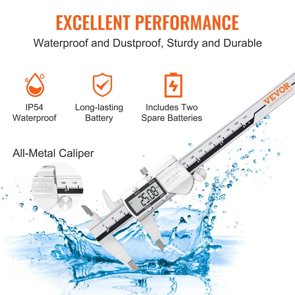 - Outstanding Performance & Zero Setting: All stainless steel body for enhanced durability, wear resistance, and rust prevention. IP54 protection guards against dust, water, and oil. Powered by a 3V CR2032 battery, with an additional two batteries included, ensuring prolonged usage of the caliper. The ZERO setting button allows new measurements to begin at any position on the scale.