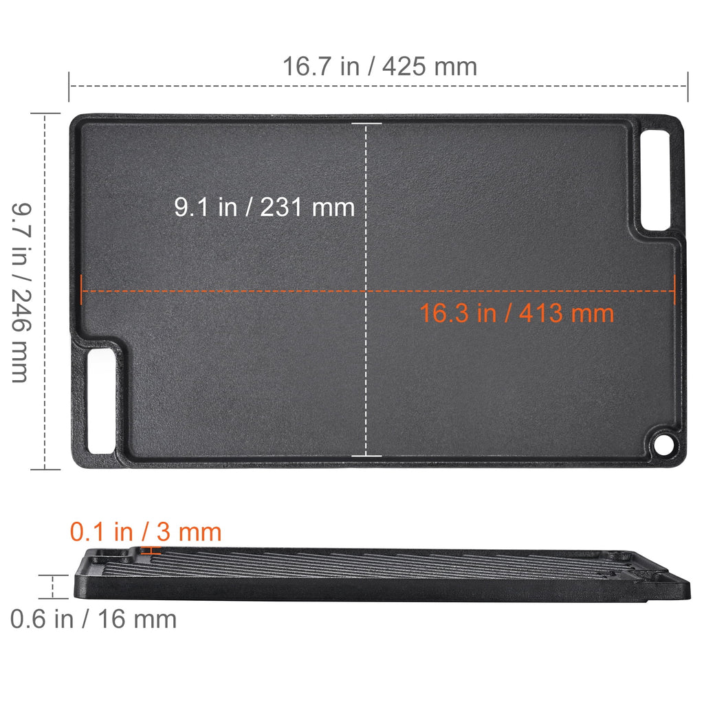 - Thickened Cast Iron Grill Pan: This flat top grill is formed in one piece with a thickness of 3.3 mm, ensuring even heat distribution and fully releasing the flavor and nutrition of the food.