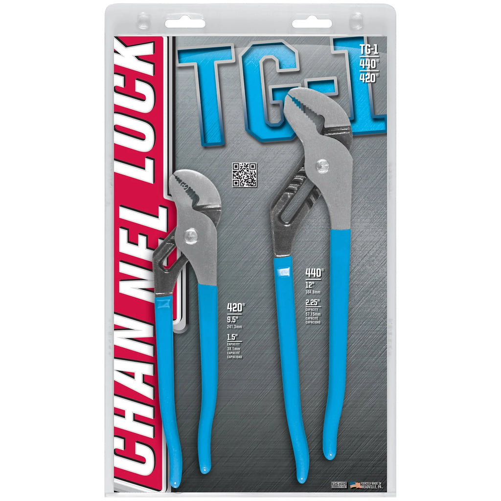 CHANNELLOCK blue grips for comfort. Right angle, laser heat-treated teeth grip better and last longer. CHANNELLOCK uses high-carbon C1080 steel for superior performance on the job and specially coated for ultimate rust prevention. Patented undercut tongue and groove design. Permalock fastener eliminates nut and bolt failure We've put together our most popular tools to create the perfect gift for people that know what real work is all about. The 2-Piece Tongue & Groove Plier Set Includes: 420 - 9.5"; Straight jaw tongue & groove plier 440 - 12"; Straight jaw tongue & groove plier