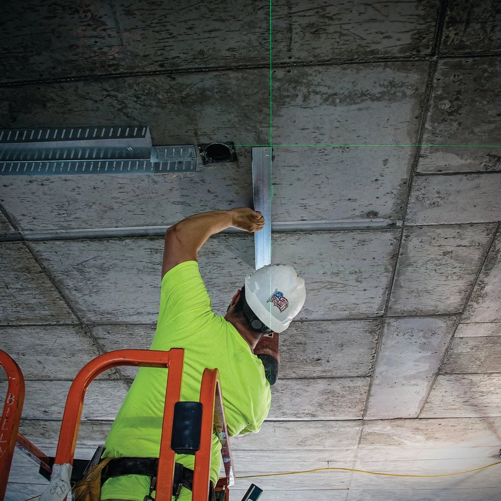 - Laser level tool features green beam laser technology