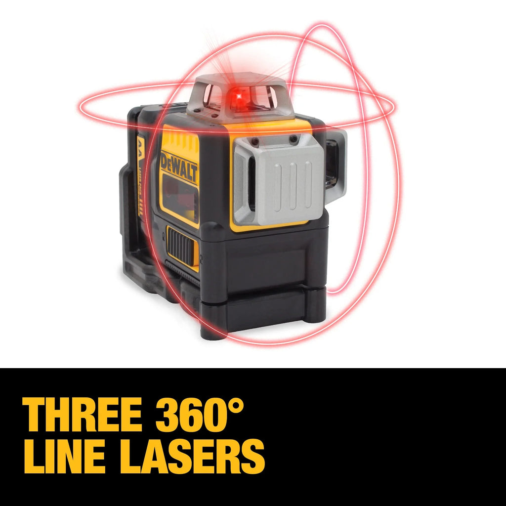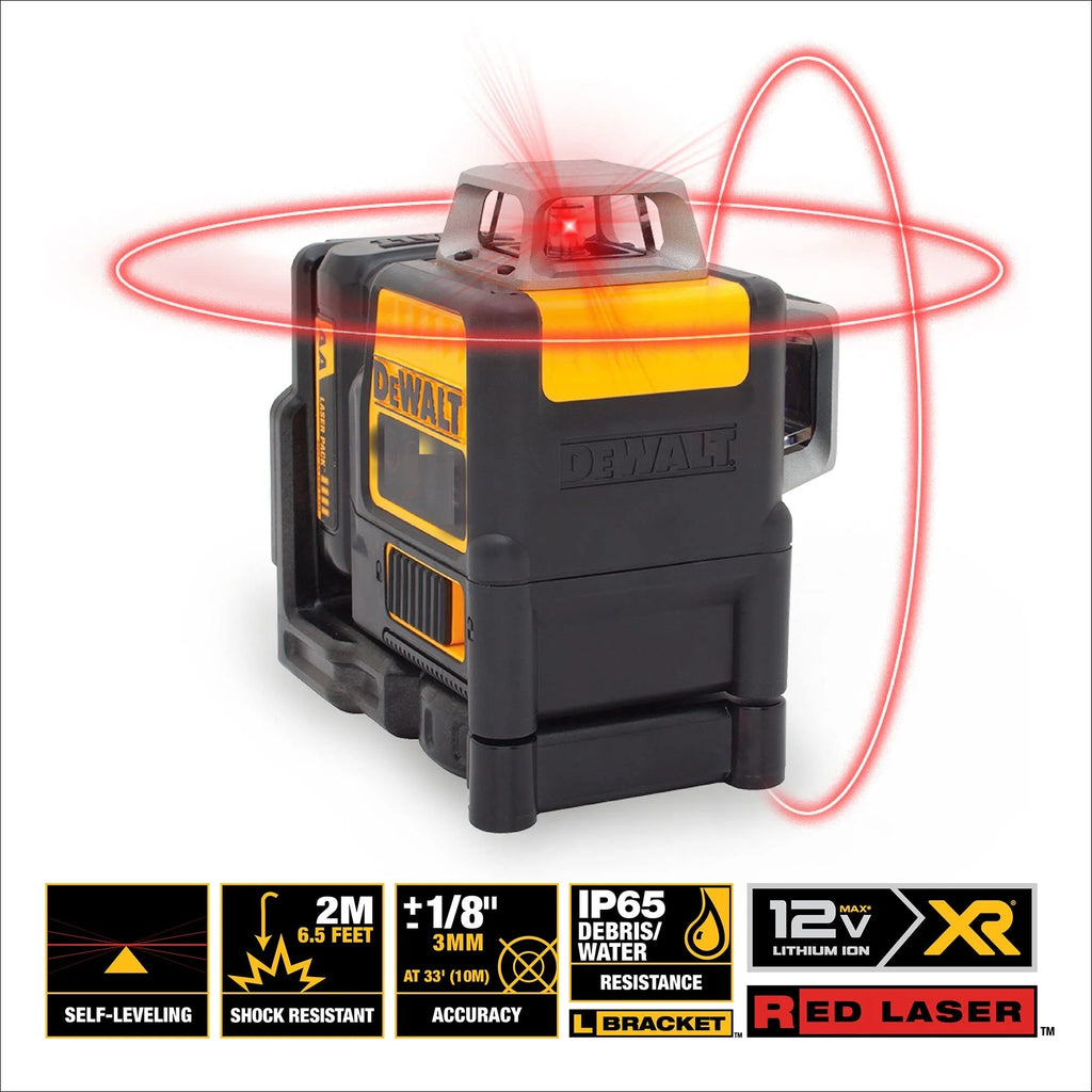 The 12V MAX Red 3x360 Laser features 12V MAX Lithium-ion battery and green beam laser technology. This laser is debris and water resistant with an IP65 rating and with an over-molded housing, it can withstand harsh conditions found on the worksite. Take on your tough jobs with the DW089LG 12-Volt Red Cross Line Laser. • 12V Lithium-ion Rechargeable Power Tool Battery Platform • Red Beam Laser Technology - • Integrated Magnetic Bracket with 1/4" and 5/8" thread • Over-molded housing and IP65 water/debris resistance • Locking Pendulum - To help prevent damage to internal components • Three 360 degree Line Laser to aid in full room Layout