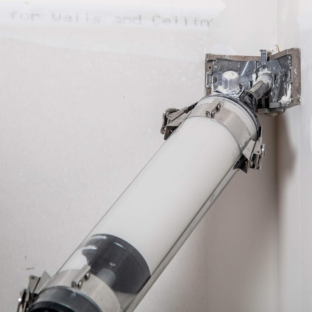 The DEWALT MudShot is a patent pending, gas-pressurized compound applicator tube that eliminates the strain of manually pushing the compound out of the tool during the traditional finishing process with a corner applicator box. It dramatically increases corner finishing efficiency while being easier on the back, the shoulders and the wrists!