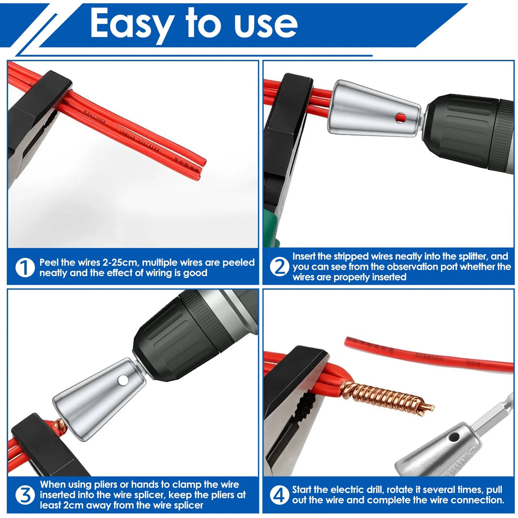 [Easy to Operate] First, peel wire 2-25cm, and the effect of stripping multiple wires neatly and has good paralleling cable effect. Second, insert the stripped wire neatly into the parallel tool, and you can see whether wires are inserted in place through the observation port. Third, use pliers or your hands to clamp wire inserted into the parallel device. When clamping, keep the distance between the pliers and the parallel wire more than 2cm. Last, start hand drill, rotate it several times, pull out wire and complete the parallel wire.